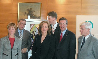 | Die Beispiel gebende Handelspreisverleihung in Dortmund: v. l. Regierungspräsidentin Renate Drewke, Einzelhandelsverbands-Vorsitzender Hans-Jürgen Klems, die charmante Preisträgerin Eva Kapellmann, der Direktor der Nationalband Uwe Müller, Dortmunds OB Dr. Gerhard Langemeyer, Einzelhandels-Geschäftsführer Dr. Wilm Schulte. | |