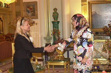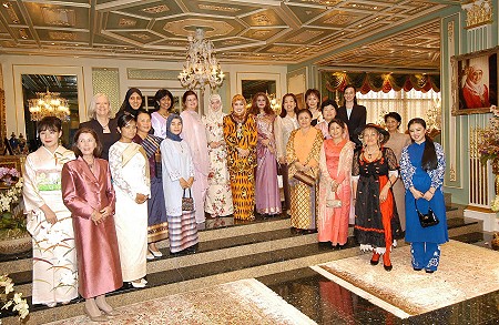 ![]() Her Majesty Queen Raja von Brunei mit den Diplomatenfrauen, darunter die Gattin des deutschen Botschafters Lilo Cappell in der Tracht der KURPFALZ, die bei der Königin besondere Beachtung genoß. |