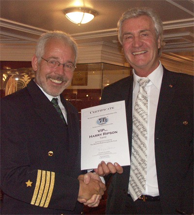 ![]() Ehrenvolle Aufnahme in die Internationale VIP-Loge: Kapitän Harold Ripson, mit Vizepräsident Folkert Klaassen |